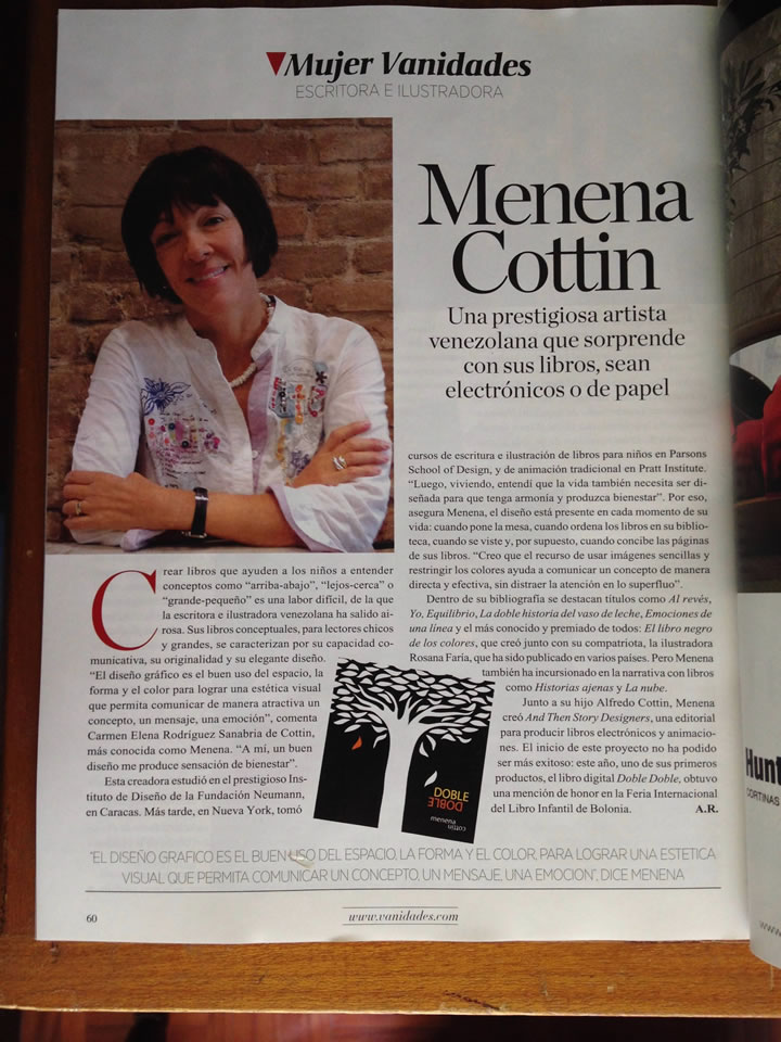 Buscando la esencia, exposición individual, El Universal, Caracas, TAC, 2016. El País.com.co, Colombia 2014 Paddy books.com 2014 Reportaje en Revista Vanidades Colección Aprendo, Últimas Noticias, Caracas, 2010 El Universal, Caracas 2008 El Mundo, Caracas 2007 La Republica, Bologna 2007 Los niños marcan la pauta de su labor, Jenny Lozano, El Universal, Caracas, 2004 Presentación del Libro "Al Reves", El Universal, Caracas, 1999 Cultura y Espectaculos, El Universal, Caracas, 1999 Vernissages, El Universal, Caracas, 1990 Juegos de Manos, El Universal, Caracas, 1990 Larga Vida y Muchos Libros, por Simón Alberto Consalvi, El Nacional Logotipo INAVI (Instituto Nacional de la Vivienda), ganador por concurso, El Nacional, Caracas, 1975. Participación en Feria del Libro de Bogotá FILBo. Mayo 2017 Participación en Uninorte incluyente, Universiada del Norte, Barranquilla, Colombia Septiembre 2017